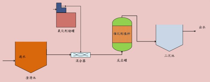 該工藝核心在于高污染物廢水中的難降解污染物在氧化劑與催化劑的作用下降解為小分子有機物,B/C比提高至0.3以上,廢水進入生化處理單元處理并達標排放。